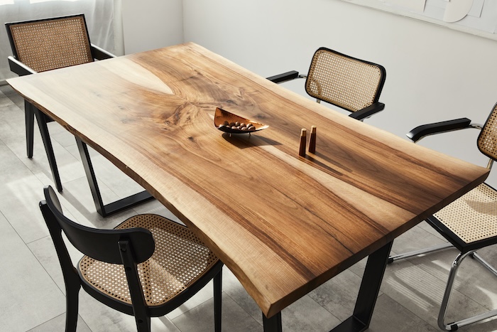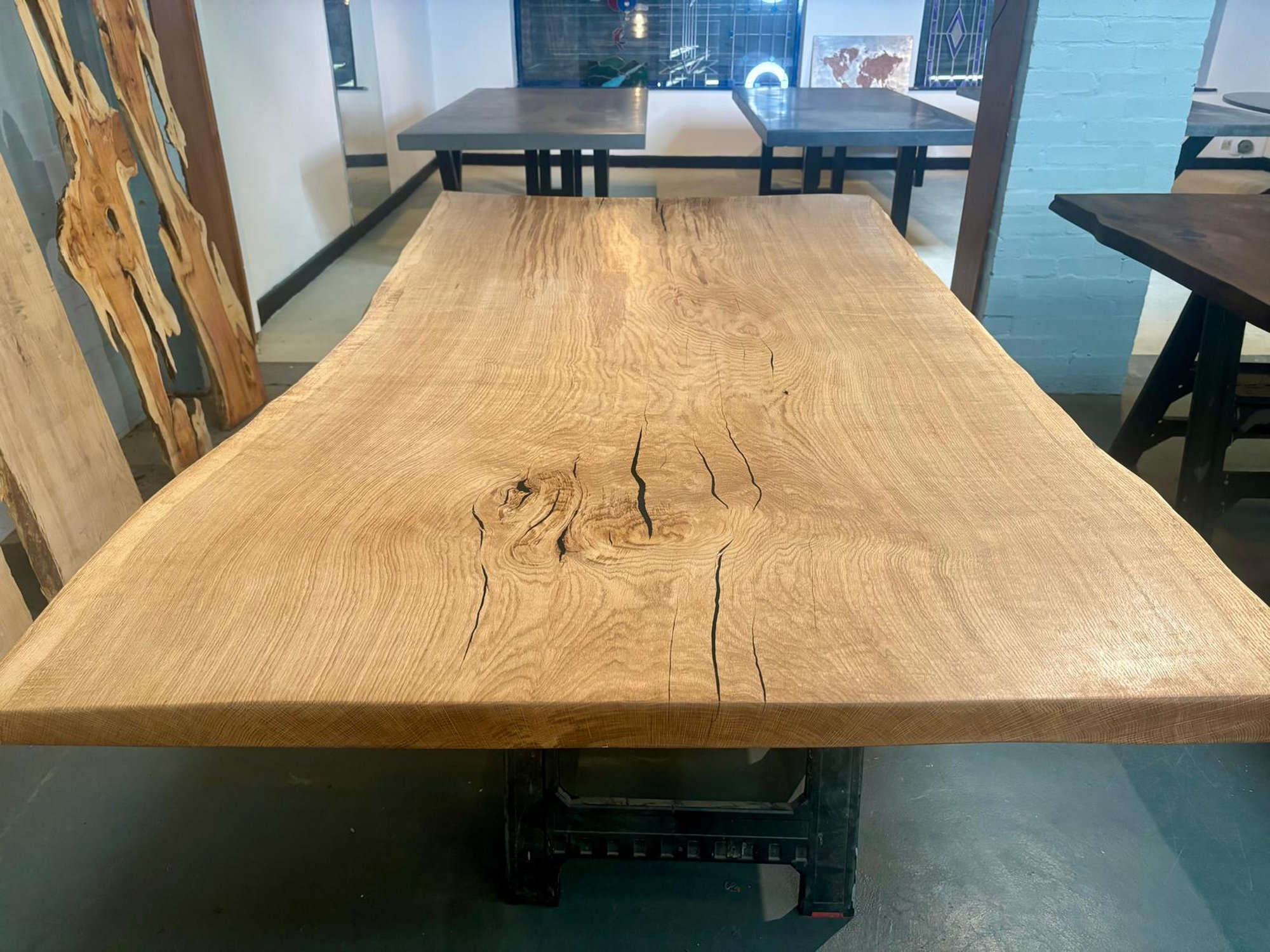 A live edge table preserves the natural contour of the tree, showcasing organic grain, knots and character while being kiln-dried and reinforced for long-term stability.