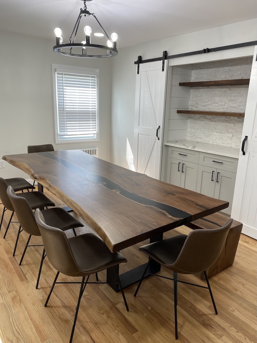 The resin isn’t just decorative. Once cured, it bonds the slabs together and adds cross-table strength, making resin river tables ideal for wide dining surfaces.